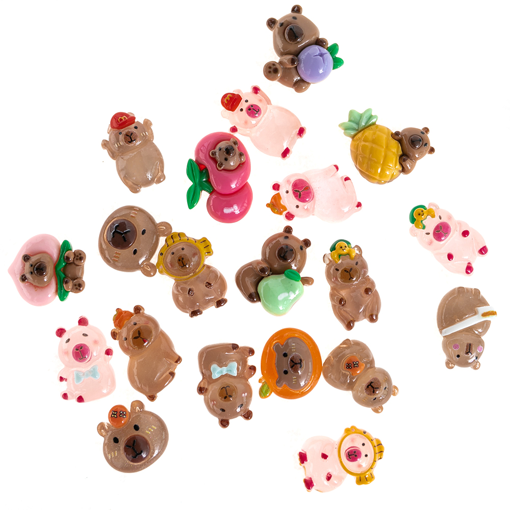 Rozkošný, priehľadný mini kufrík naplnený dvadsiatimi rozkošnými, pastelovo sfarbenými živicovými figúrkami kapybary s plochými základňami – ideálny ako darček pre deti alebo ako pôvabný dekoratívny prvok v scrapbookových projektoch.