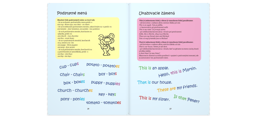 Praktická brožúrka Angličtina ZŠ do vrecka obsahuje prehľad anglickej gramatiky pre 1. stupeň základných škôl. Jednotlivé gramatické javy sú doplnené príkladmi, ale i hravými obrázkami a farebnou grafikou.