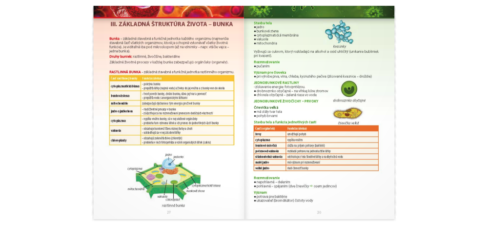 Praktická publikácia zhrňujúca poznatky z oblasti živej prírody je výborným pomocníkom nielen pre žiakov základnej školy. Na 96 stranách ponúka množstvo informácií a fotografií, ktoré prehľadne sumarizujú vedomosti o živých organizmoch, ich stavbe a životných prejavoch. Osobitná pozornosť je venovaná človeku, jeho telu a vplyvom na ľudské zdravie.