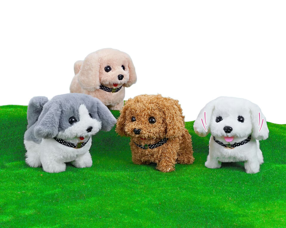 Psík na batérie chodí, hýbe hlavou a chvostom.