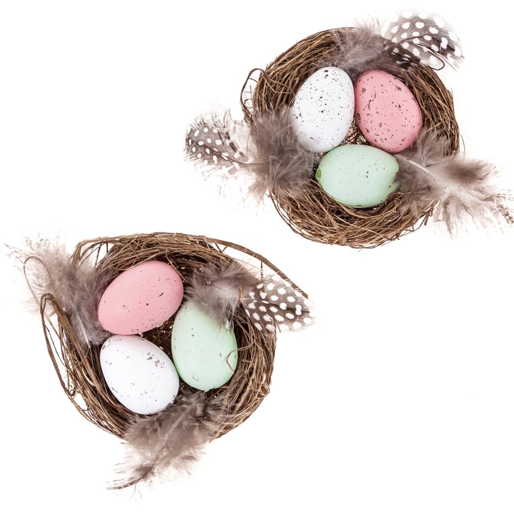 Tieto ozdobné hniezda s bodkovanými vajíčkami v troch farbách a ozdobnými pierkami sú perfektným doplnkom pre veľkonočné a jarné kreatívne projekty. Môžete ich použiť na vytvorenie bytových dekorácií, napr. vencov, stredových dekorácií, ozdobných kupol alebo rôznych závesných dekorácií. Sú vhodné aj na celoročné projekty, napr. do rustikálnych interiérov. Hniezda sú tiež skvelou dekoráciou samy o sebe. Počet hniezd v balení: 2. Veľkosť: 8 cm.