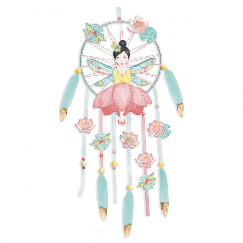 DIY sada na zhotovenie lapača snov. Do kruhu obmotaného stuhou pripevníš niťami papierovú lotosovú vílu. Na kruh uviažeš stuhy s korálkami, pierkami a papierovými ozdobami. Časti z tvrdého papiera sú detailne ilustrované. Výsledok pôsobí veľmi poeticky, dopĺňaný metalickým leskom. Lapač snov je utešená závesná dekorácia, ktorá zachytí a odvedie zlé sny.