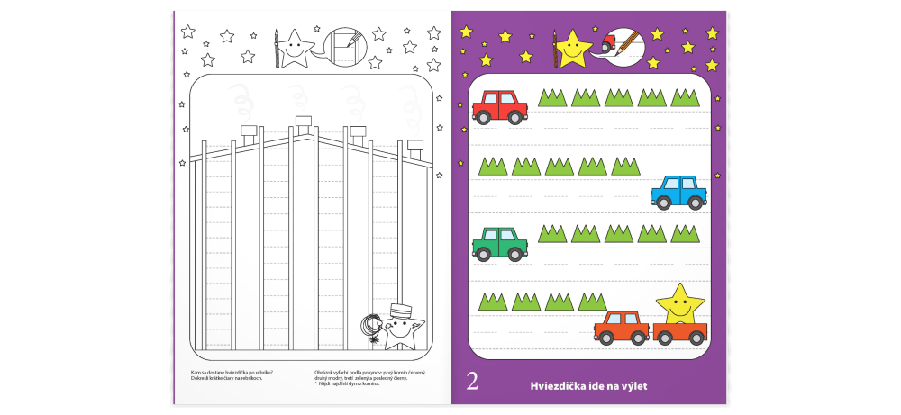 Pracovný zošit Hviezdička obsahuje 100 pracovných listov s najrôznejšími cvičeniami zameranými na nácvik jemnej grafomotoriky. Úlohy pomôžu nielen rozcvičiť ruku, ale dieťa naučia aj to, ako sa správne drží ceruzka a neskôr bude hravo kresliť čiarky či vlnky. Okrem jemnej motoriky si rozvíja aj koordináciu pohybu ruky, zápästia a prstov, ktorá je vhodnou prípravou na nácvik písania.