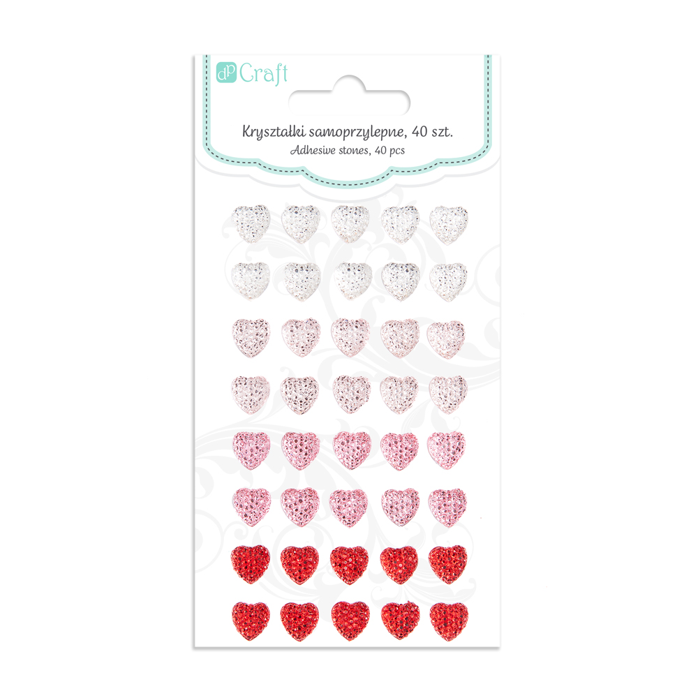 Tieto samolepiace kryštály *Srdcia* sú jedinečným doplnkom pre všetky druhy projektov: výrobu pohľadníc, scrapbooking, bytové dekorácie a mnoho ďalších. Sada obsahuje srdcia v štyroch jedinečných farbách - bielej, svetloružovej, ružovej a červenej, všetky s trblietavými čiastočkami. Rozžiarte svoje projekty!