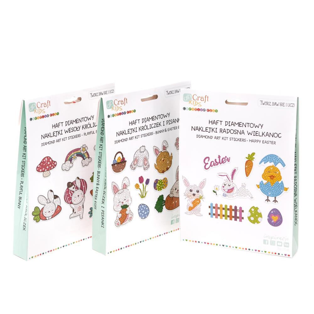 Samolepky s diamantovou výšivkou sa dajú aplikovať na rôzne detské predmety, napr. na puzdrá na telefón, topánky, zošity, peračníky alebo raňajkové krabičky. Tieto krásne veľkonočné potlače a krásne farby kryštálov sú receptom na fantastickú zábavu pre deti!