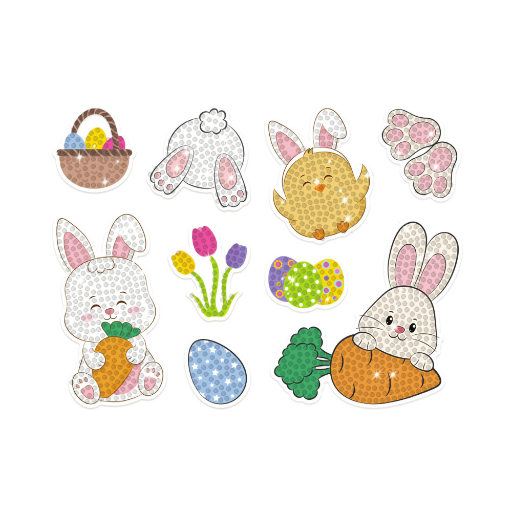 Samolepky s diamantovou výšivkou „Zajačik“ a „Veľkonočné vajíčka“ – 9 samolepiek s krásnymi veľkonočnými motívmi s priehľadnou farebnou fóliou na ozdobenie farebnými kryštálmi. Malá veľkosť samolepiek je skutočnou výhodou. Deťom trvá nalepenie jedného prvku krátko, takže sa nenechajú odradiť.
