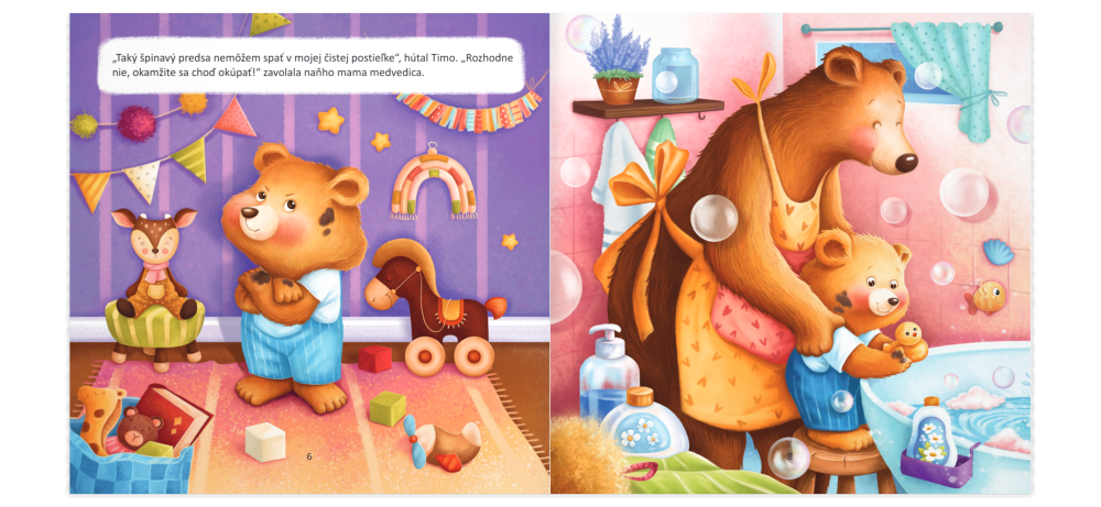 Medvedík Timo si myslí, že kúpanie je nudné a strašidelné zároveň – voda je studená, mydlo štípe a vaňa je veľmi veľká. S maminou pomocou však zistí, že kúpanie môže byť čarovné dobrodružstvo plné vôní, bubliniek, smiechu a fantázie.