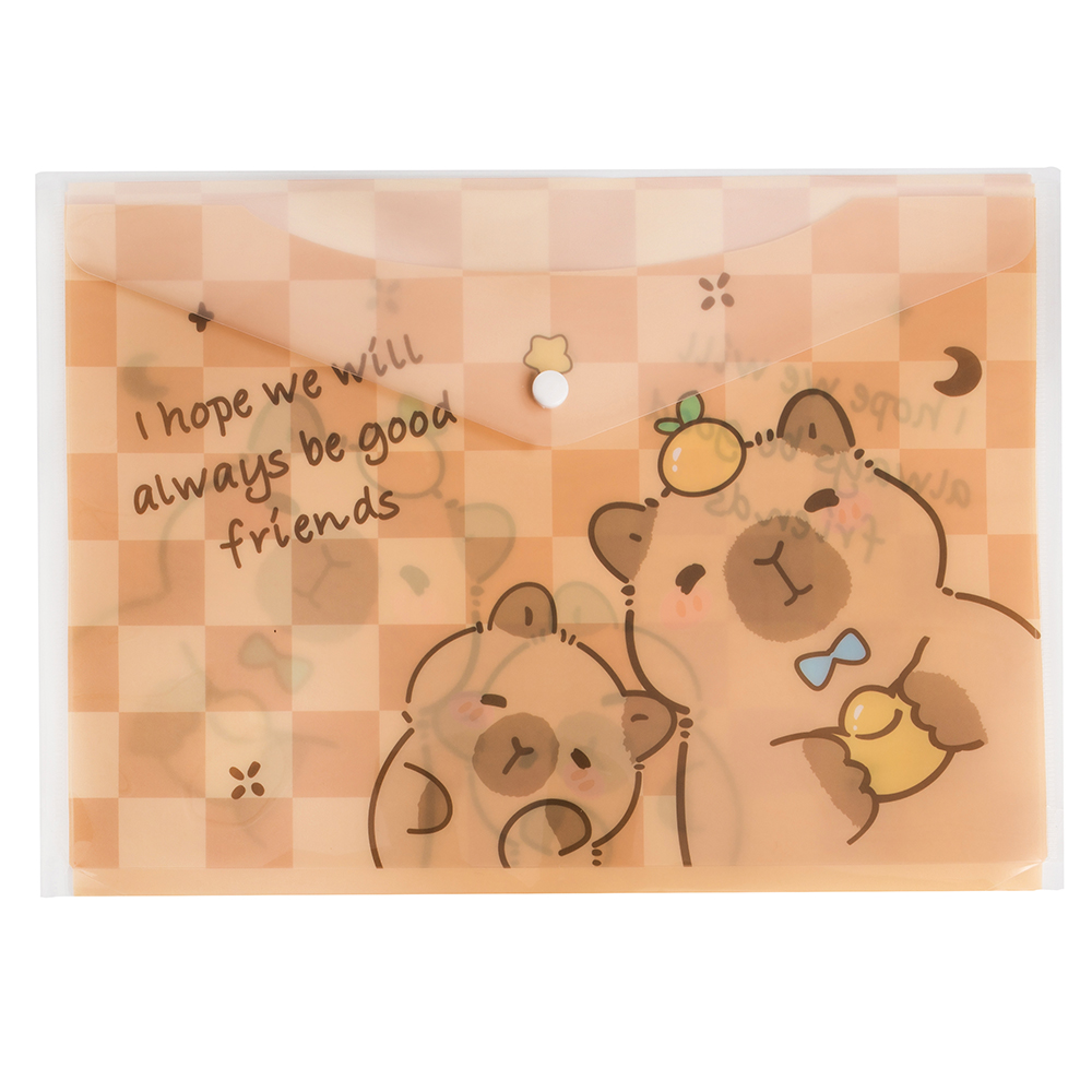 Praktický obal A4 s praktickým zapínaním na gombík, ideálny na ukladanie dokumentov. Zdobený roztomilým motívom kapybary v béžovej farbe je ideálny do školy, kancelárie alebo domáceho použitia.