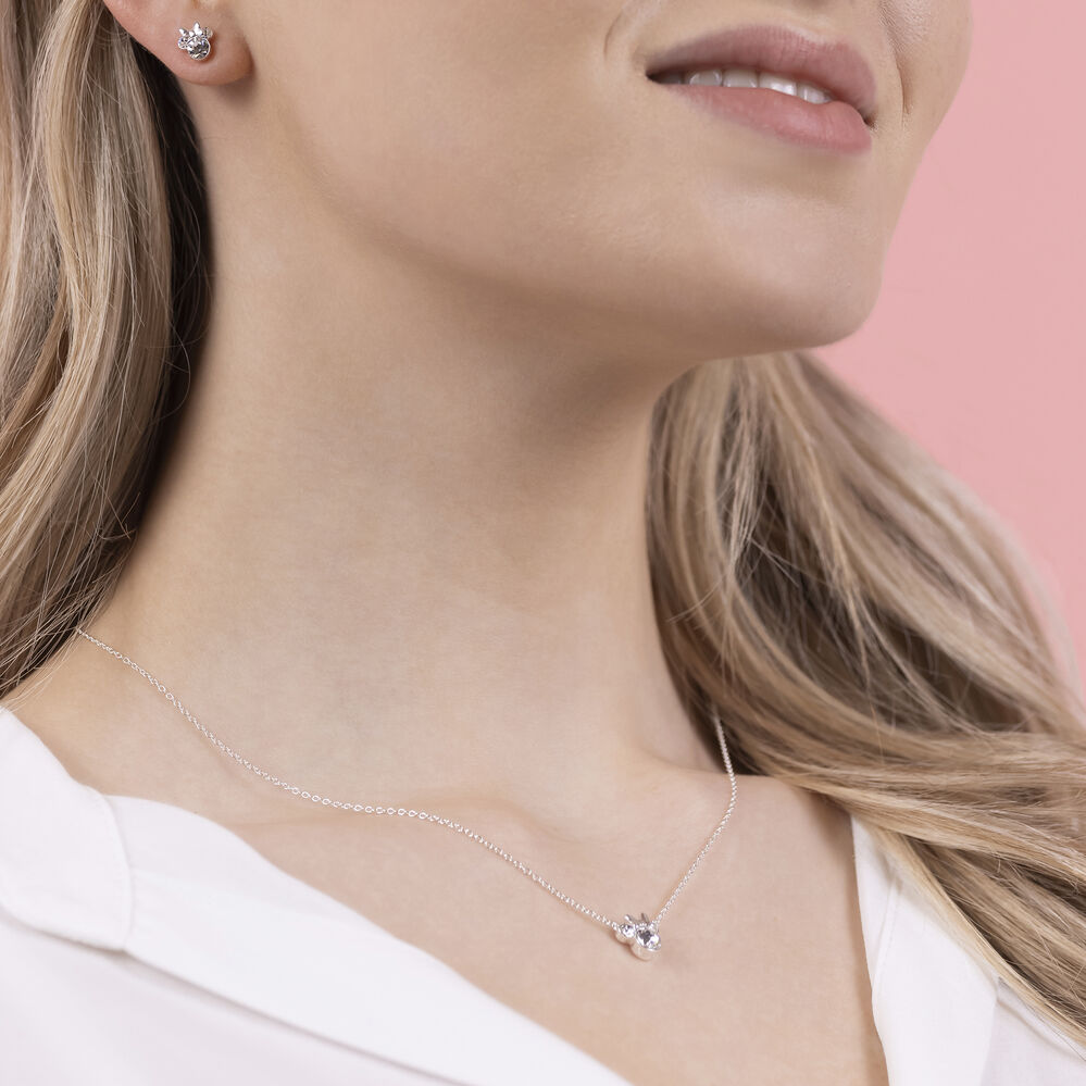 Sada obsahuje postriebrený náhrdelník Minnie Mouse s čírymi kryštálmi a náušnice.