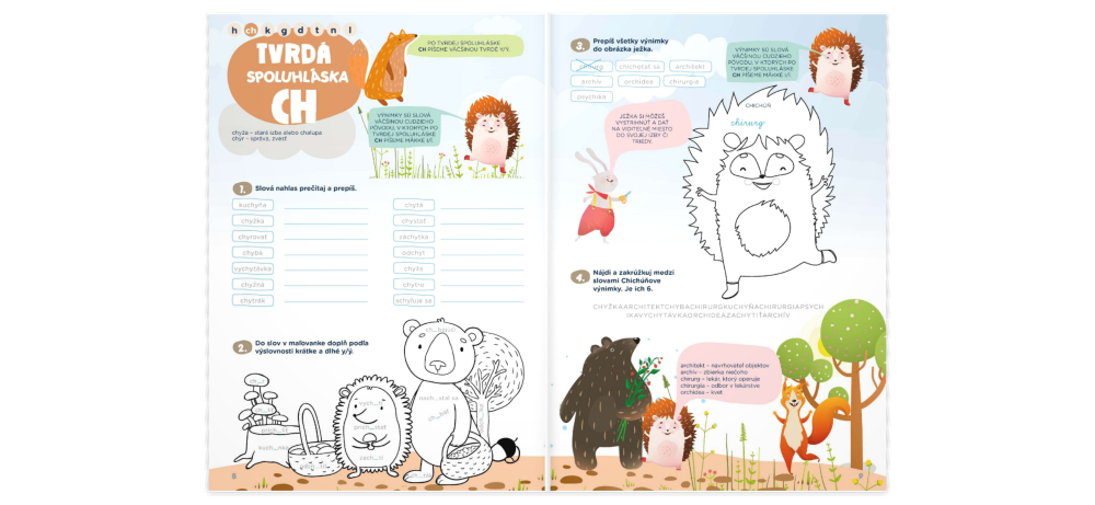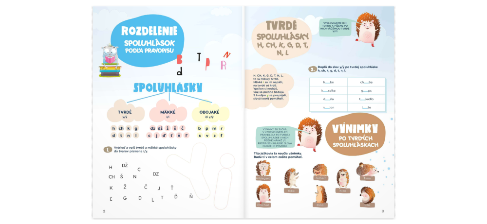 Zošitom sprevádzajú veselí ježkovia, ktorí žiakov naučia pravopisné výnimky – ide o slová väčšinou cudzieho pôvodu, v ktorých po tvrdej spoluhláske nasleduje mäkké i/í a po mäkkej spoluhláske sa v nich píše tvrdé y/ý. Rozmanité úlohy (doplňovanie, vymaľovávanie, prepisovanie, spájanie, krúžkovanie či dokonca vystrihovanie) sú vhodné na precvičovanie v rámci školského vyučovania, ale aj na individuálne upevňovanie vedomostí v domácom prostredí.