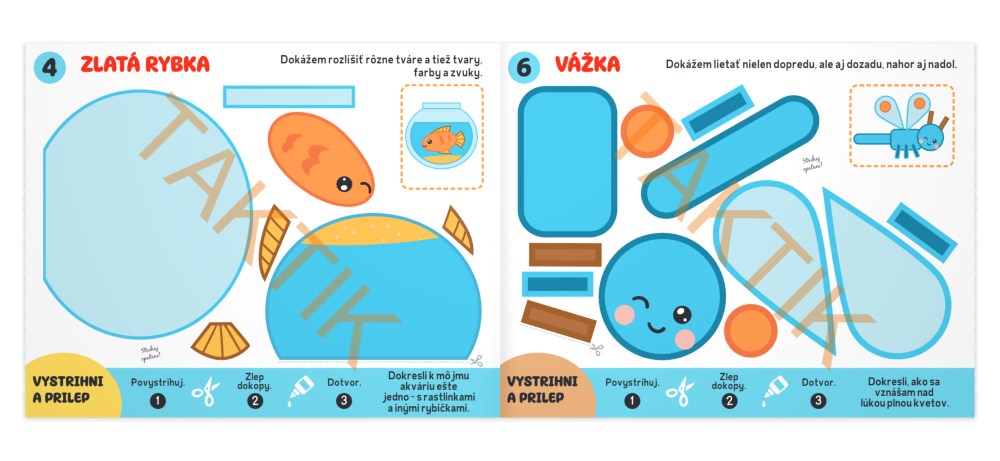Objekty na vystrihnutie majú rôzne rozmery, aby si deti čo najlepšie precvičili pršteky, jemnú motoriku, presnosť, koncentráciu aj trpezlivosť. Po vystrihnutí je dôležité jednotlivé komponenty správne poskladať, čím si malí drobci trénujú logické myslenie. Nalepovaním si zase cibria zmysel pre detail. Samozrejme, že pomocnú ruku k dielu môžu priložiť aj rodičia.