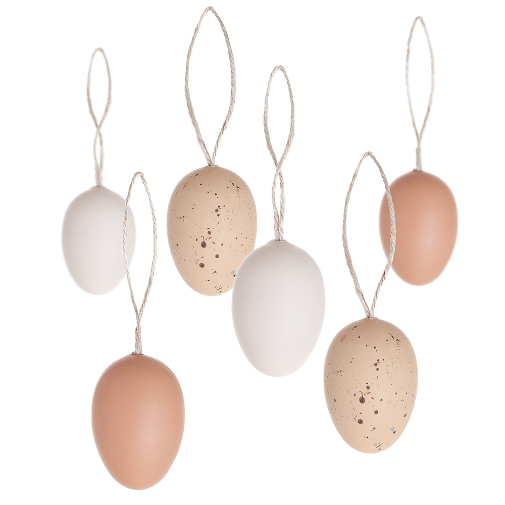 Vajíčka so šnúrkou na zavesenie, vyrobené z nerozbitného materiálu. Vďaka vysokému štandardu spracovania vyzerajú veľmi prirodzene a perfektne sa hodia do eko štýlu. Môžu byť samostatnou dekoráciou alebo prvkom veľkonočnej kompozície.